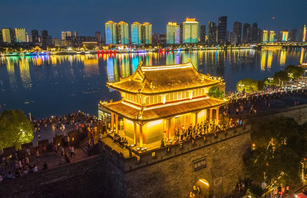 夜幕降臨,襄陽古城燈光璀璨、游人如織。(楊東 攝)