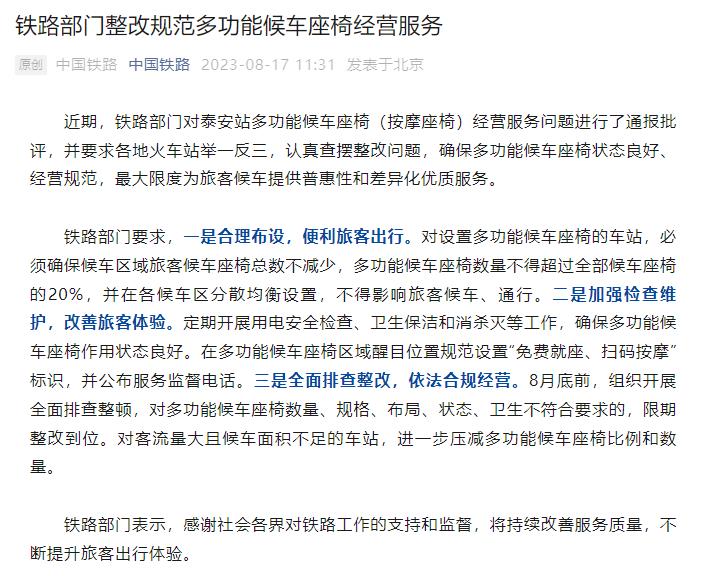 鐵路部門要求,一是合理布設(shè),便利旅客出行。對設(shè)置多功能候車座椅的車站,必須確保候車區(qū)域旅客候車座椅總數(shù)不減少,多功能候車座椅數(shù)量不得超過全部候車座椅的20%,并在各候車區(qū)分散均衡設(shè)置,不得影響旅客候車、通行。二是加強(qiáng)檢查維護(hù),改善旅客體驗。定期開展用電安全檢查、衛(wèi)生保潔和消殺滅等工作,確保多功能候車座椅作用狀態(tài)良好。在多功能候車座椅區(qū)域醒目位置規(guī)范設(shè)置“免費就座、掃碼按摩”標(biāo)識,并公布服務(wù)監(jiān)督電話。三是全面排查整改,依法合規(guī)經(jīng)營。8月底前,組織開展全面排查整頓,對多功能候車座椅數(shù)量、規(guī)格、布局、狀態(tài)、衛(wèi)生不符合要求的,限期整改到位。對客流量大且候車面積不足的車站,進(jìn)一步壓減多功能候車座椅比例和數(shù)量。