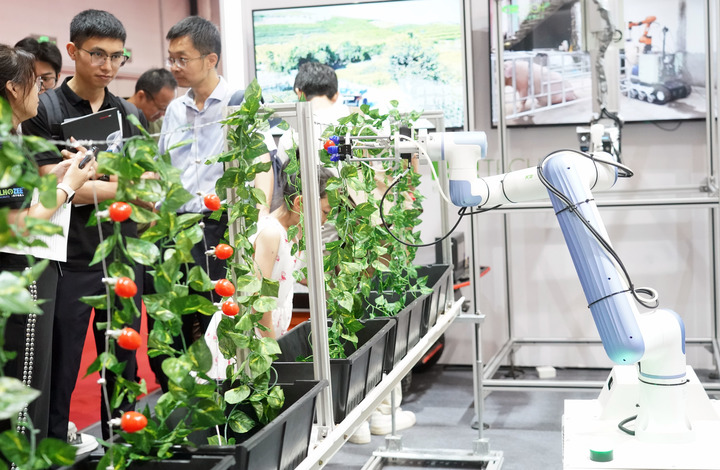 在農(nóng)業(yè)展區(qū),碩大的果園多臂采摘機(jī)器人引人注目。機(jī)械手臂通過位置和光感靈敏伸出準(zhǔn)確抓住一個蘋果,讓觀眾對農(nóng)業(yè)現(xiàn)代化和智能化有了更直觀的了解。這款機(jī)器人由北京市農(nóng)林科學(xué)院智能裝備技術(shù)研究中心研制,通過機(jī)械臂和果實獲取裝置,實現(xiàn)采果、納果、儲果全程自動化采收,并具備晝夜連續(xù)作業(yè)的能力,每小時可以采摘400至550果,大幅提升了采摘效率。
