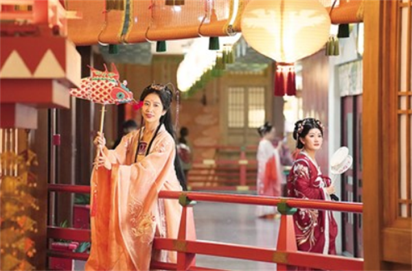 在遍布名勝古跡的西安市內(nèi),還有一座“平行時(shí)空里的長(zhǎng)安”。走進(jìn)長(zhǎng)安十二時(shí)辰主題街區(qū),游客不僅可以身著唐代服飾穿行在市井街區(qū),與游街花魁來(lái)個(gè)親密接觸,還能手握“開元通寶”代幣,到酒肆里買壺好酒,觀看歌舞。