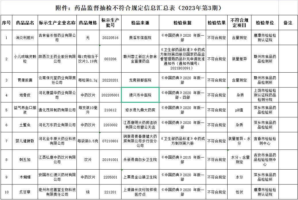 近日,江西省發(fā)布2023年第3期藥品監(jiān)督抽檢信息公告,公告內(nèi)容具體如下: