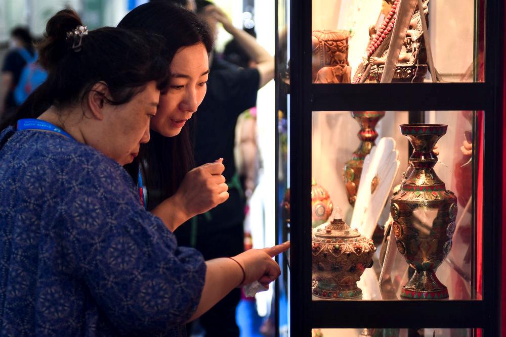 △2023年8月24日,參觀者在第十四屆中國—東北亞博覽會現(xiàn)場選購尼泊爾特色商品。