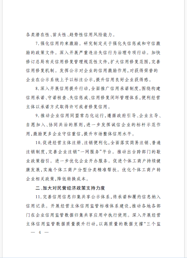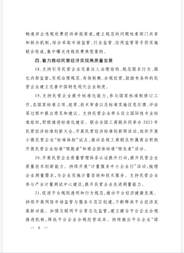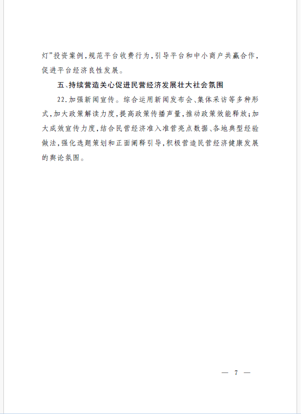 22條舉措聚焦五個方面,落實(shí)《意見》部署要求,回應(yīng)了民營經(jīng)濟(jì)各類關(guān)切:一是持續(xù)優(yōu)化民營經(jīng)濟(jì)發(fā)展環(huán)境。持續(xù)破除市場準(zhǔn)入壁壘,全面落實(shí)公平競爭政策制度,強(qiáng)化制止濫用行政權(quán)力排除、限制競爭的反壟斷執(zhí)法,完善社會信用激勵約束機(jī)制,健全失信行為糾正后的信用修復(fù)機(jī)制。二是加大對民營經(jīng)濟(jì)政策支持力度。完善信用信息歸集共享,健全中小微企業(yè)和個體工商戶信用評級和評價體系。完善支持政策直達(dá)快享機(jī)制。三是強(qiáng)化民營經(jīng)濟(jì)發(fā)展法治保障。持續(xù)完善知識產(chǎn)權(quán)保護(hù)體系,完善監(jiān)管執(zhí)法體系,杜絕選擇性執(zhí)法,健全涉企收費(fèi)長效監(jiān)管機(jī)制。四是著力推動民營經(jīng)濟(jì)實(shí)現(xiàn)高質(zhì)量發(fā)展。支持民營企業(yè)參與標(biāo)準(zhǔn)制定,計(jì)量服務(wù)中小企業(yè)。依法規(guī)范和引導(dǎo)民營資本健康發(fā)展,推動平臺經(jīng)濟(jì)健康發(fā)展。五是持續(xù)營造關(guān)心促進(jìn)民營經(jīng)濟(jì)發(fā)展壯大社會氛圍,及時推廣經(jīng)驗(yàn)做法,加大宣傳。