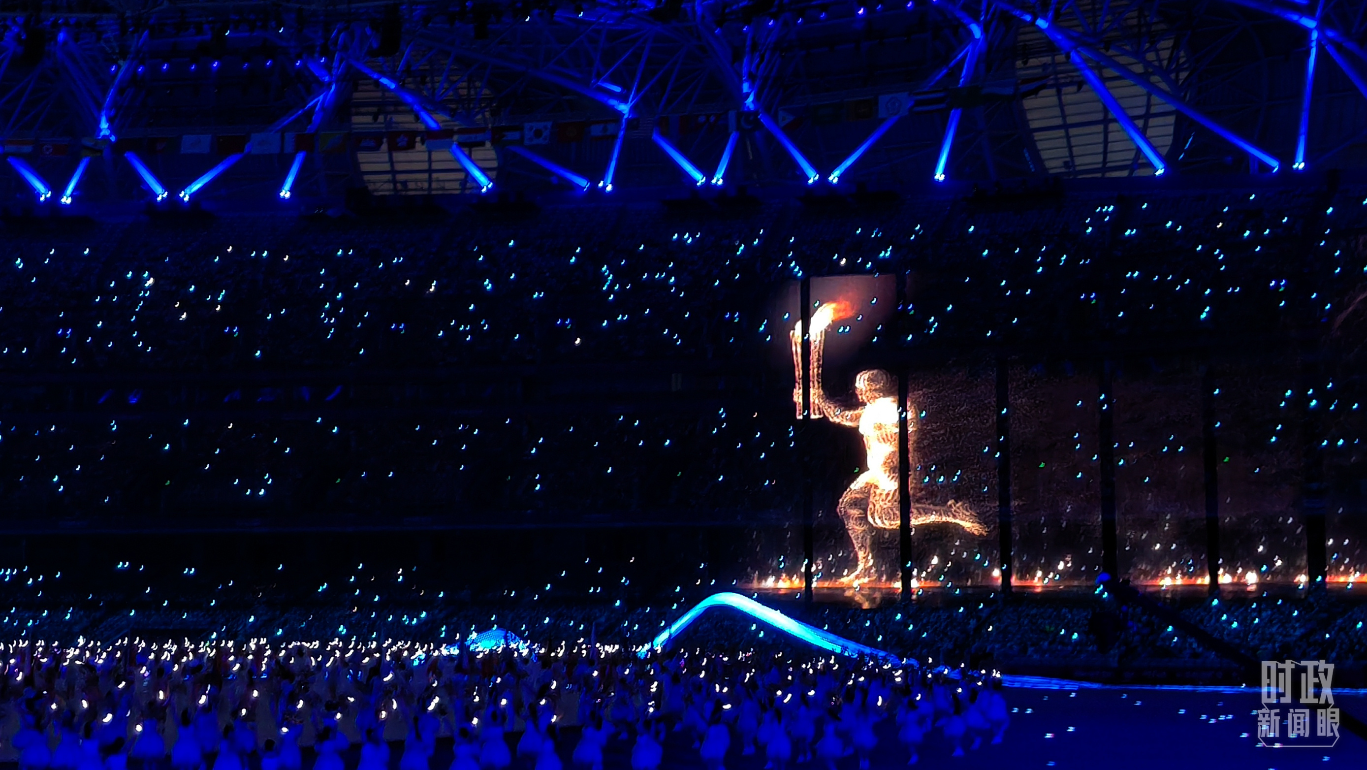 △"數(shù)字火炬手"入場,與現(xiàn)場火炬手共同點燃主火炬。(總臺央視記者王子杭、總臺國廣記者李晉拍攝)