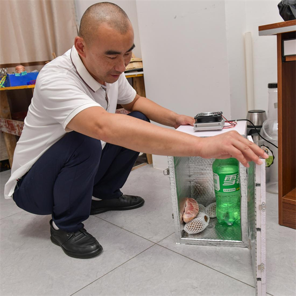 只有初中文憑的楊波就開始學(xué)習(xí)冰箱知識(shí),了解冰箱原理結(jié)構(gòu):為什么會(huì)制冷還能調(diào)節(jié)溫度?等等,做到了了然于胸,又購(gòu)買了冷卻片、制冷片、散熱片、風(fēng)扇、溫度計(jì)、封條等必備用料,自己又在工地找到了廢棄的塑膠板,在家具店里找來(lái)隔熱錫紙,經(jīng)過(guò)一番折騰,一臺(tái)高60 厘米、寬40厘米、厚40厘米的手工小冰箱做成功了。使用2個(gè)月來(lái),最低溫度可達(dá)2攝氏度。效果非常好!