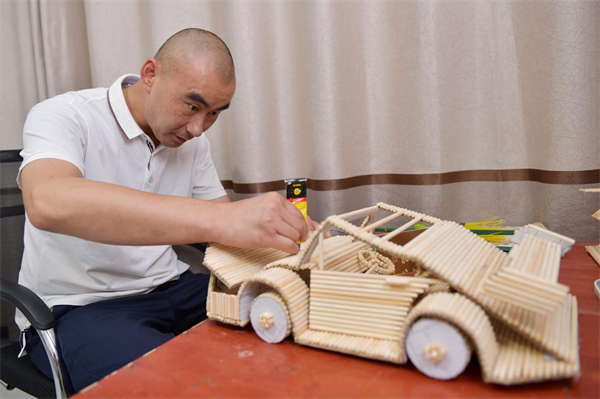 編制了一段時(shí)間的小手鏈、小掛件、小燈籠等等小工藝品后,楊波購(gòu)買了一次性筷子自己做了一個(gè)煙盒。這個(gè)煙盒只要一按按鈕,煙支就會(huì)自動(dòng)彈出,而且煙嘴朝上。隨后,楊波又購(gòu)買了許多一次性筷子,做一輛轎車模型,不曾想,等到了安裝擋風(fēng)玻璃時(shí),小轎車散架了。分析原因,是因?yàn)閳A柱狀筷子之間的粘和面積太小不牢靠。楊波找了一些紙板當(dāng)墊板,使筷子的粘和面變成2處,牢固程度提高1倍,前前后后有10多天,一輛筷子車模做成功了。