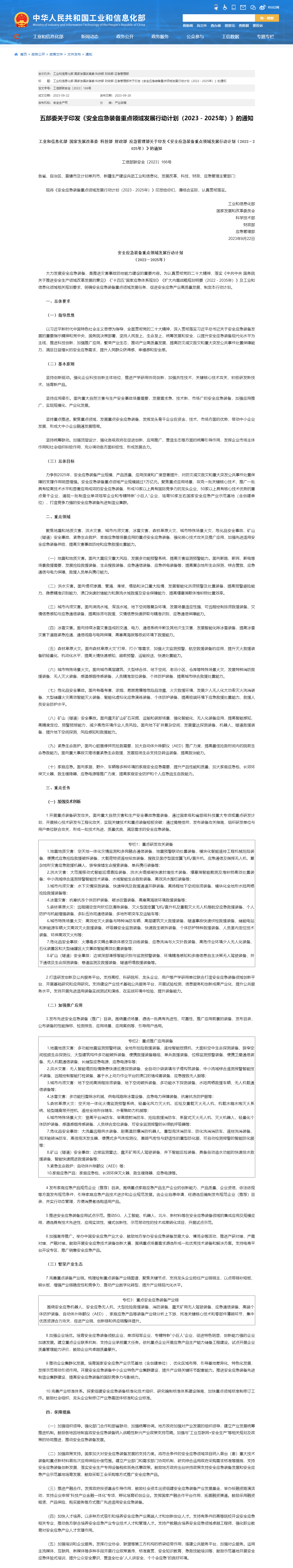 工信部官網(wǎng)消息,近日,工業(yè)和信息化部、國家發(fā)展改革委、科技部、財政部、應急管理部等五部門聯(lián)合印發(fā)《安全應急裝備重點領(lǐng)域發(fā)展行動計劃(2023-2025年)》。其中提出,力爭到2025年,安全應急裝備產(chǎn)業(yè)規(guī)模、產(chǎn)品質(zhì)量、應用深度和廣度顯著提升,對防災減災救災和重大突發(fā)公共事件處置保障的支撐作用明顯增強。安全應急裝備重點領(lǐng)域產(chǎn)業(yè)規(guī)模超過1萬億元。聚焦重點應用場景,攻克一批關(guān)鍵核心技術(shù),推廣一批具有較高技術(shù)水平和顯著應用成效的安全應急裝備,形成10家以上具有國際競爭力的龍頭企業(yè)、50家以上具有核心技術(shù)優(yōu)勢的重點骨干企業(yè),涌現(xiàn)一批制造業(yè)單項冠軍企業(yè)和專精特新“小巨人”企業(yè),培育50家左右國家安全應急產(chǎn)業(yè)示范基地(含創(chuàng)建單位),打造競爭力強的安全應急裝備先進制造業(yè)集群。
