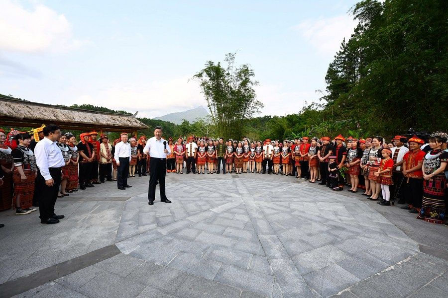 2022年4月11日下午,習(xí)近平在海南省五指山市水滿鄉(xiāng)毛納村同村民們親切交流。