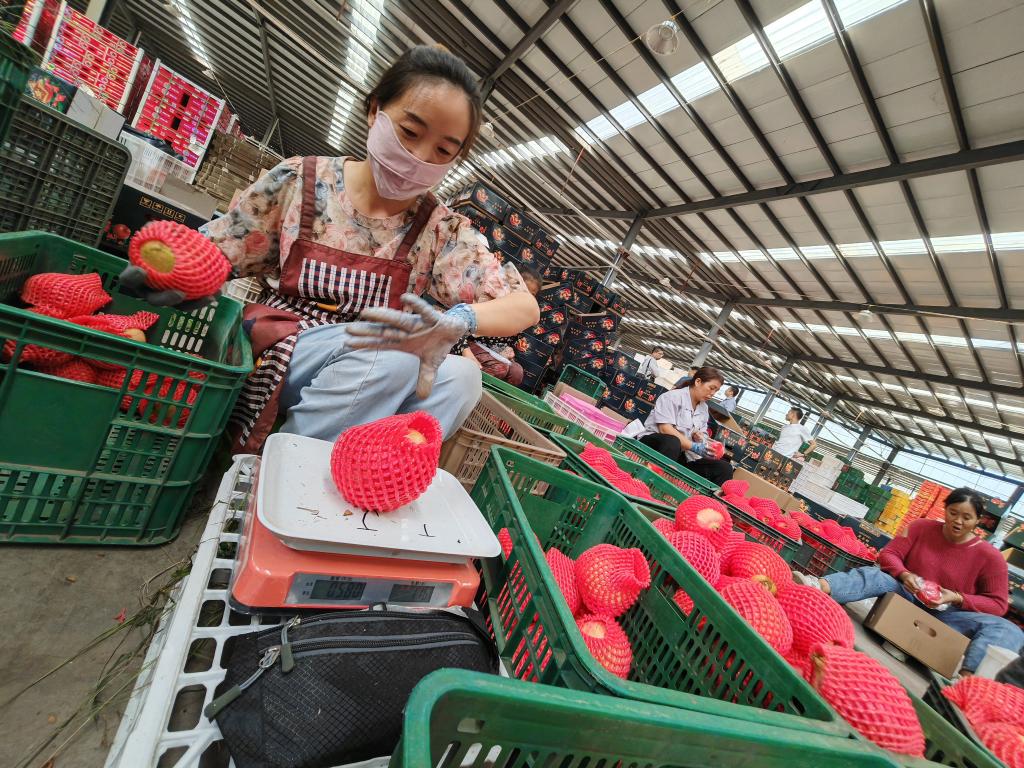 9月19日,會(huì)理市鹿廠鎮(zhèn)白草村農(nóng)產(chǎn)品物流園區(qū),務(wù)工人員正在分揀石榴果。新華社記者江毅 攝