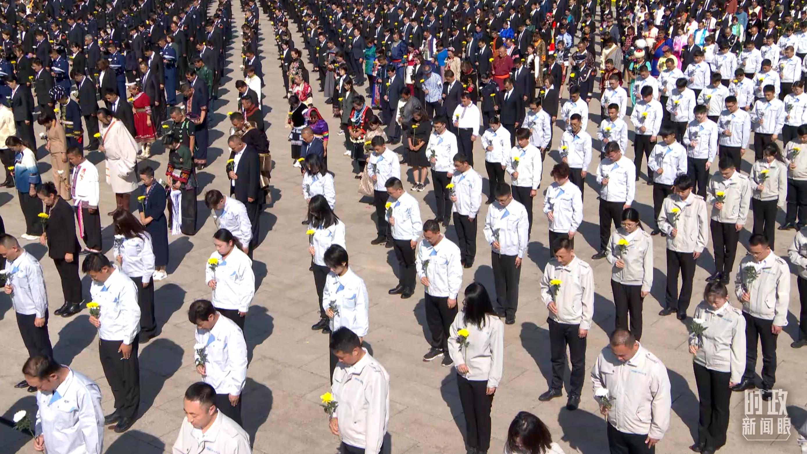△首都各界代表依次走到紀念碑碑前,獻上手中鮮花。(總臺央視記者段德文、鄂介甫拍攝)