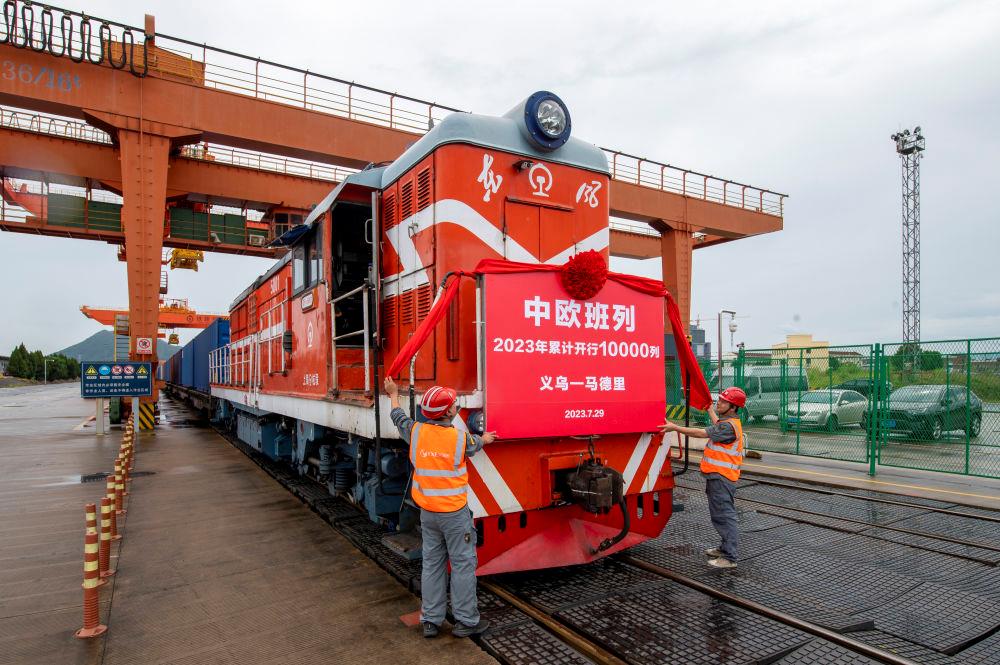 △2023年7月29日,滿載110個標(biāo)箱出口貨物的X8020次中歐班列從浙江義烏西站準(zhǔn)備啟程。