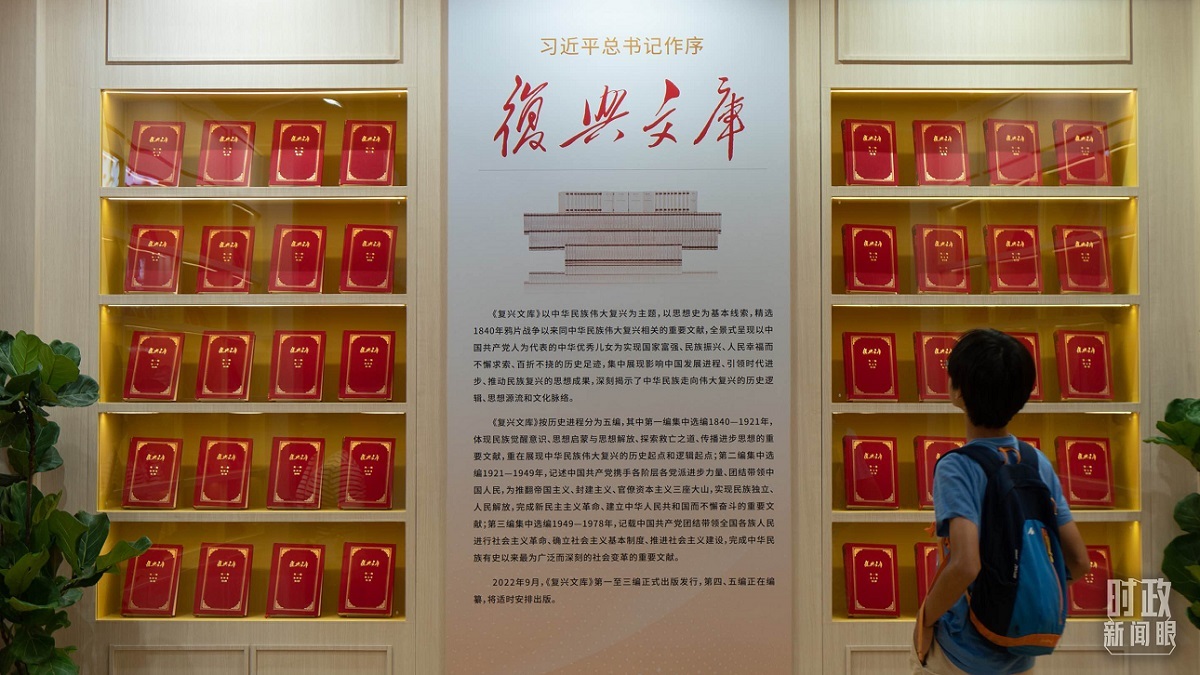 △2023年8月16日,2023上海書(shū)展開(kāi)幕,書(shū)展設(shè)置的“復(fù)興文庫(kù)”主題書(shū)籍展示區(qū)吸引讀者駐足查看。(圖/視覺(jué)中國(guó))
