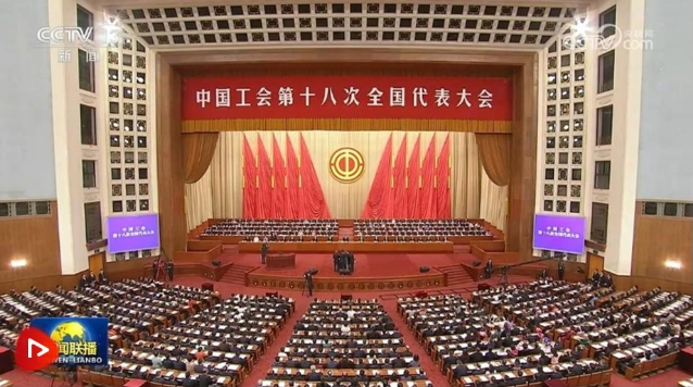 人民大會堂大禮堂氣氛熱烈。主席臺上方懸掛著“中國工會第十八次全國代表大會”的會標,后幕正中象征著中國工會和中國工人階級團結(jié)統(tǒng)一的工會會徽熠熠生輝,10面紅旗分列兩側(cè)。二樓眺臺懸掛著“堅持以習(xí)近平新時代中國特色社會主義思想為指導(dǎo),全面貫徹黨的二十大精神,組織動員億萬職工為全面建設(shè)社會主義現(xiàn)代化國家、全面推進中華民族偉大復(fù)興團結(jié)奮斗!”的巨型橫幅。