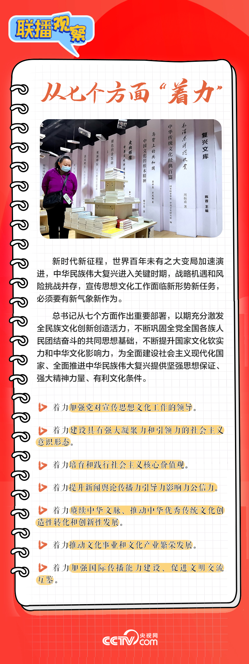 近日,習(xí)近平總書(shū)記對(duì)宣傳思想文化工作作出重要指示,提出“新的文化使命”“首要政治任務(wù)”等論斷,并要求從七個(gè)方面著力,為全面建設(shè)社會(huì)主義現(xiàn)代化國(guó)家、全面推進(jìn)中華民族偉大復(fù)興提供堅(jiān)強(qiáng)思想保證、強(qiáng)大精神力量、有利文化條件。