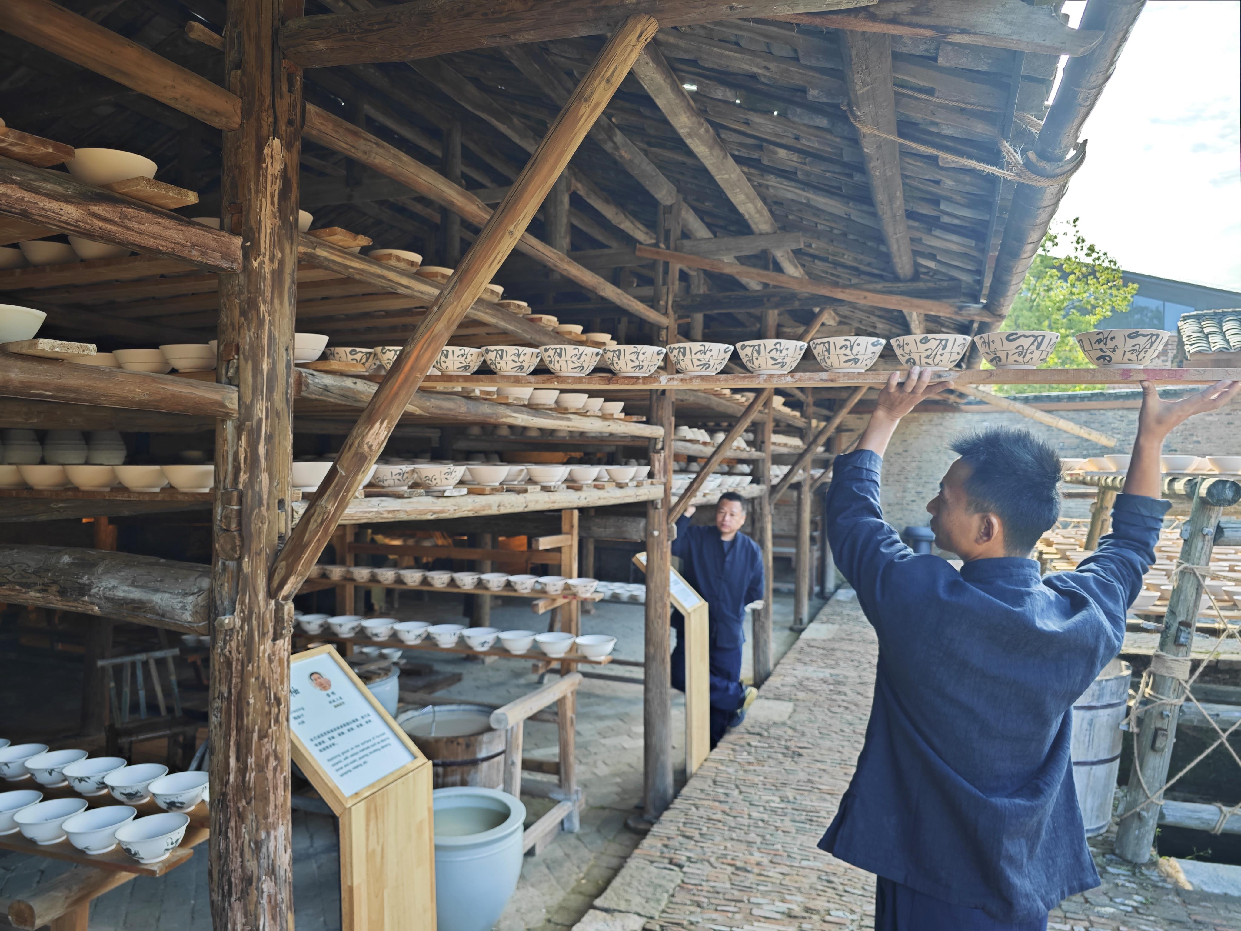 △陶陽里歷史文化街區(qū)里,工匠將陶瓷工藝品放到架上晾干。(總臺(tái)央視記者彭漢明拍攝)