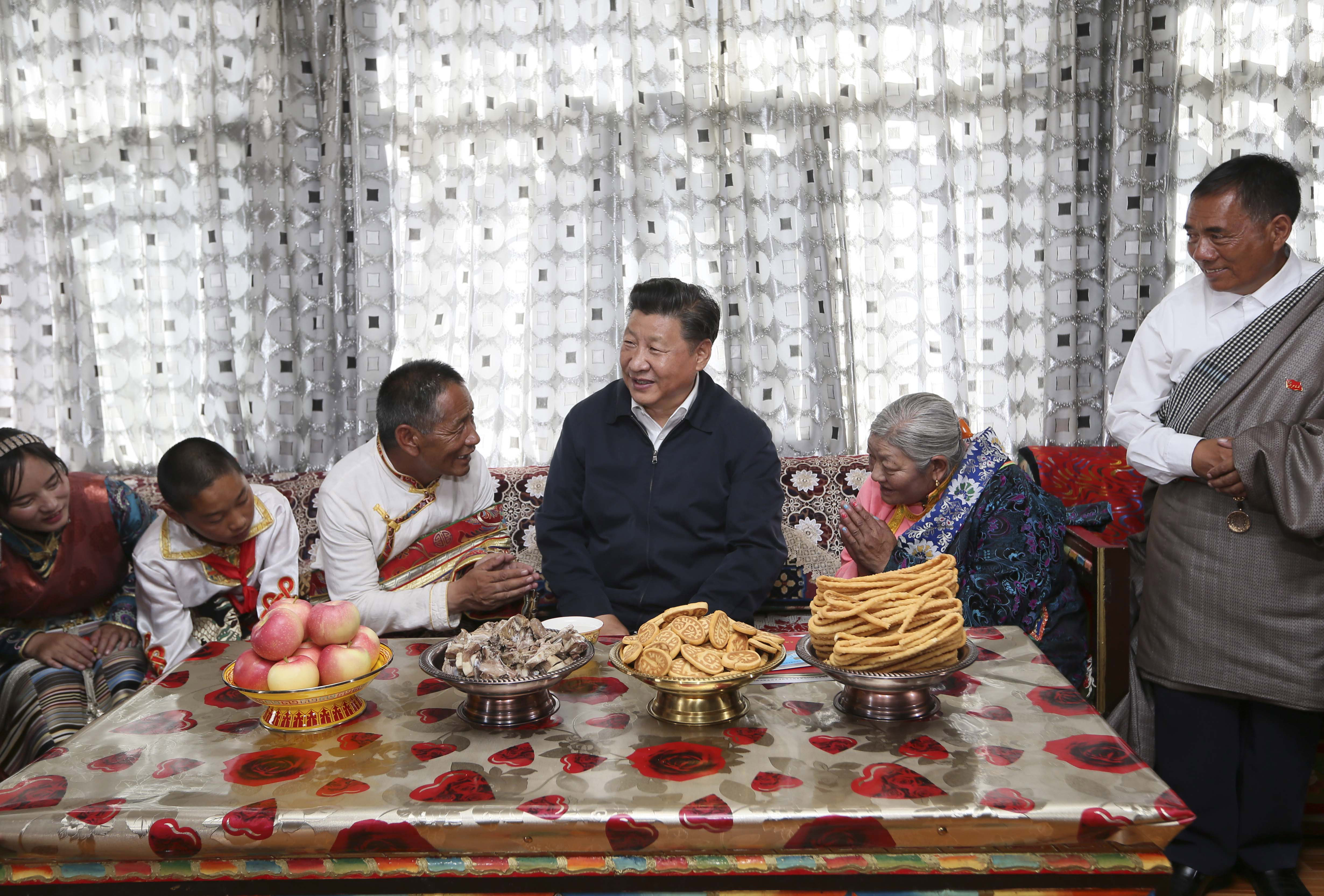 2016年8月22日,習近平在青海海西蒙古族藏族自治州格爾木市唐古拉山鎮(zhèn)長江源村藏族村民申格家中同一家人親切交談。