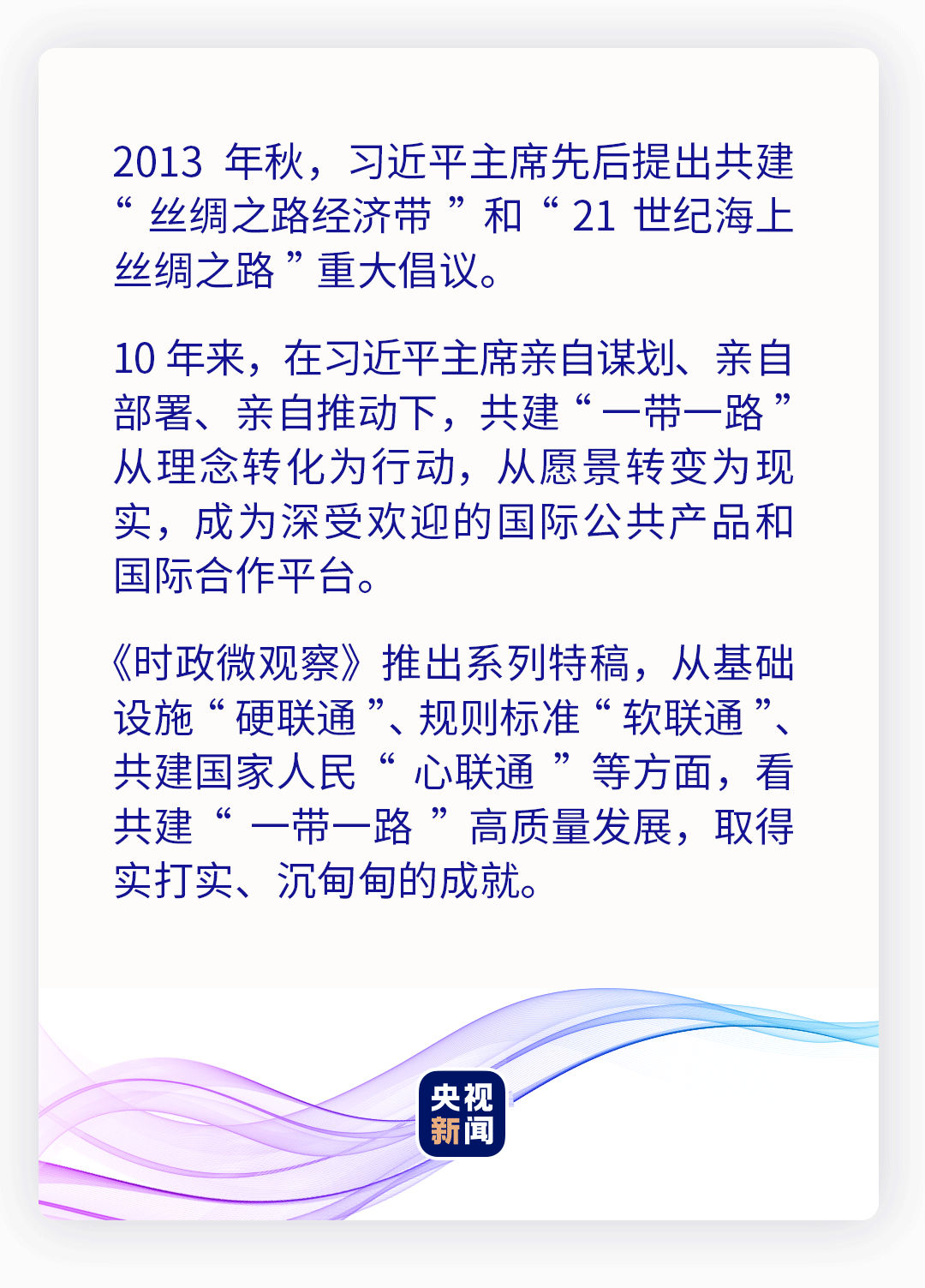 10年來(lái),共建"一帶一路"以高標(biāo)準(zhǔn)、可持續(xù)、惠民生為目標(biāo),以規(guī)則標(biāo)準(zhǔn)"軟聯(lián)通"為重要支撐,為促進(jìn)全球互聯(lián)互通、共同發(fā)展增添新動(dòng)力,推動(dòng)高質(zhì)量共建"一帶一路"不斷走深走實(shí)。