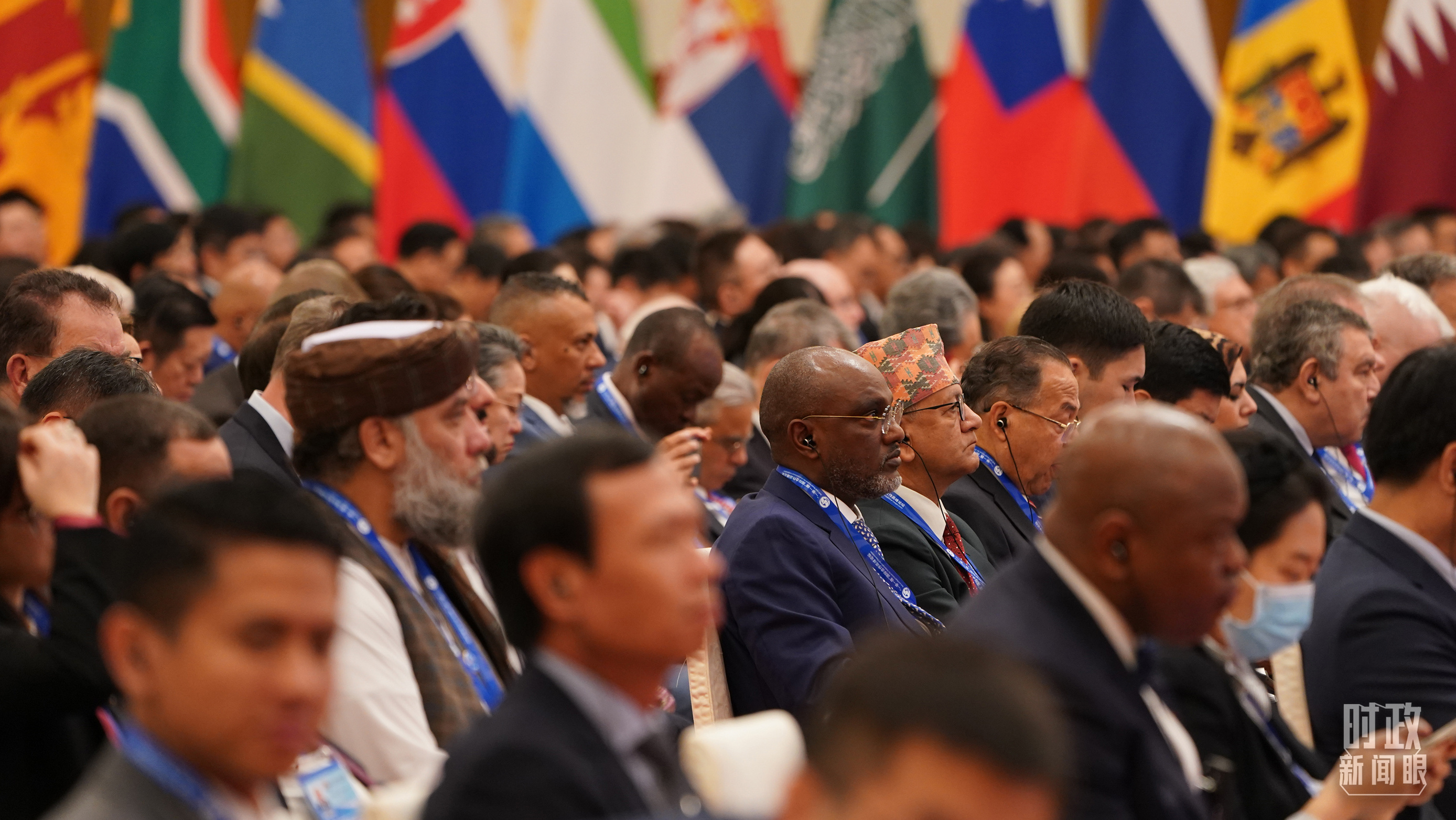 紅毯鋪地,鮮花點(diǎn)綴。150多面共建“一帶一路”國家國旗和聯(lián)合國旗,整齊分列會(huì)場(chǎng)兩側(cè)。