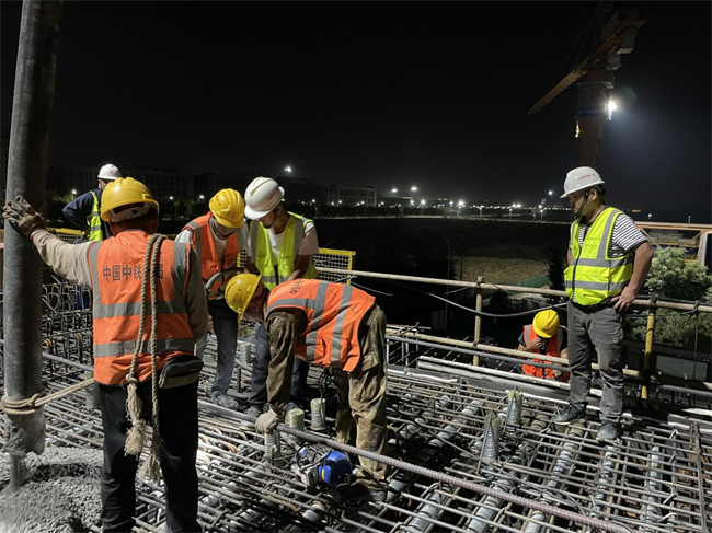 整個澆筑自10月15日下午4點(diǎn)44分開始,至10月16日早上7點(diǎn)30分結(jié)束,共用時14.77小時,本次澆筑采用泵送加下料管入模、附著式平板振動器加插入式振動器相結(jié)合的施工工藝,澆筑混凝土共計305方。此次澆筑為后續(xù)連續(xù)梁施工奠定了良好的基礎(chǔ),標(biāo)志著跨京滬高鐵立交特大橋施工正式進(jìn)入控制性工程。