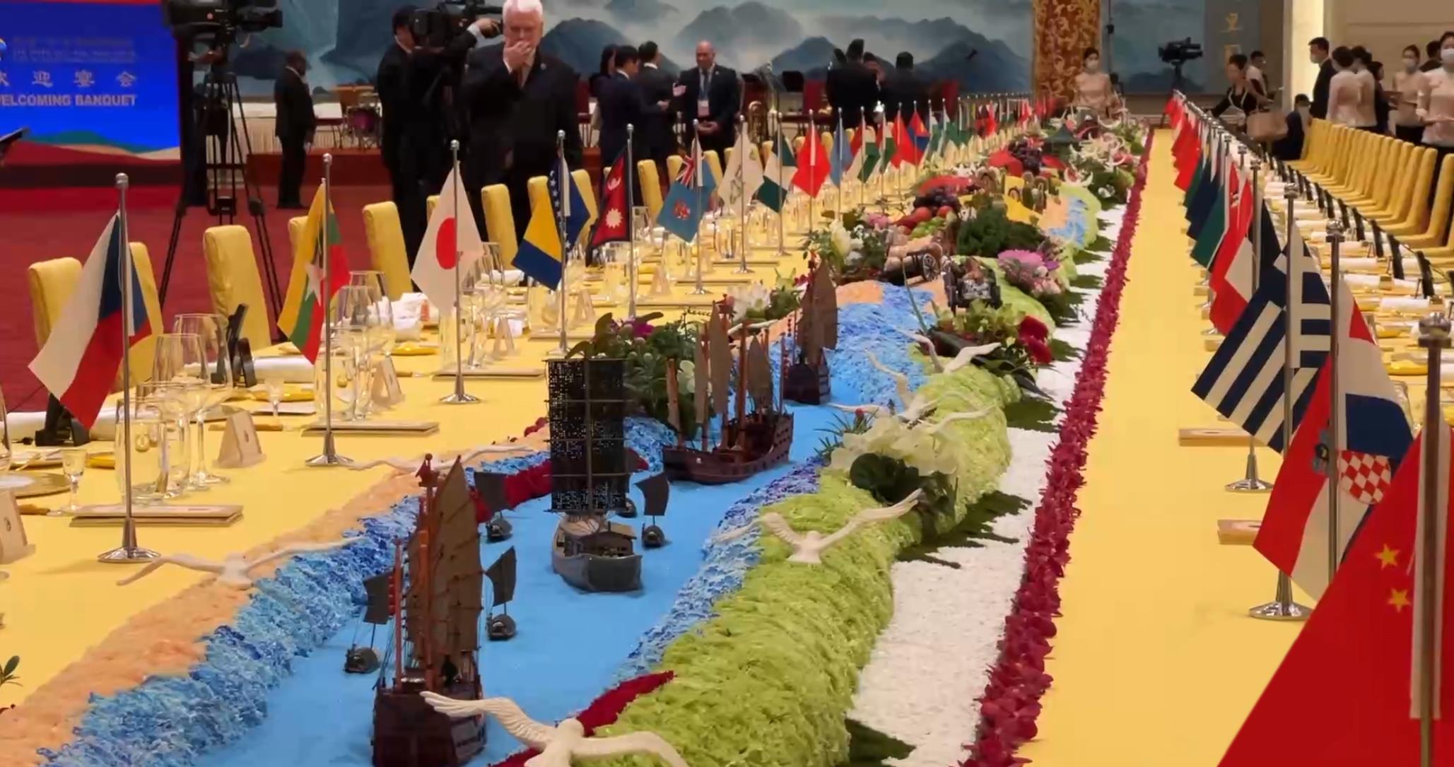 在10月17日晚舉行的歡迎宴會(huì)上,嘉賓們被這樣一個(gè)細(xì)節(jié)深深打動(dòng)——晚宴餐臺(tái)以“撫古觀今、擁抱未來”為主題,南側(cè)展示著古代絲綢之路的微觀景象:海邊碼頭上擺放著對(duì)外出口的瓷器、絲綢、茶葉等貿(mào)易物資,路上擺放有從西域引進(jìn)的蔬菜瓜果;餐臺(tái)北側(cè)為21世紀(jì)絲綢之路的景觀:以北京天壇的裝飾為起點(diǎn),中間穿插高鐵、中歐班列、新能源汽車等擺件,展現(xiàn)各國互聯(lián)互通的景象……