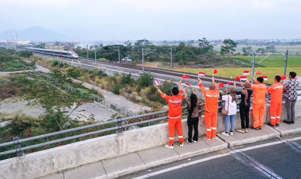 △2023年10月17日,在印度尼西亞萬(wàn)隆一座天橋上,雅萬(wàn)高鐵中國(guó)建設(shè)者和印尼籍員工揮舞著中國(guó)和印尼兩國(guó)國(guó)旗,向遠(yuǎn)處駛來的一列雅萬(wàn)高鐵高速動(dòng)車組列車歡呼。