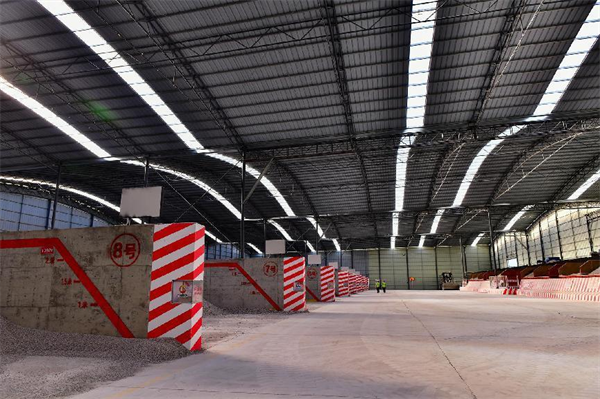 項目施工,拌和站建設(shè)必是首當(dāng)其沖。5、8標(biāo)拌和站建設(shè),大門劃分出分流道,使人車各行其道;設(shè)置保安室、門禁系統(tǒng),實行嚴(yán)格管里;劃分拌和作業(yè)區(qū)、材料堆放區(qū)及運輸車輛停放區(qū),起到有序作業(yè);站區(qū)設(shè)置自動噴淋洗車池、廢水沉淀池,布設(shè)排水系統(tǒng);拌和站四周設(shè)置圍墻圍欄,安裝視頻監(jiān)控系統(tǒng),實行封閉式、可視式實時管理;水泥拌和樓主體全封包,上料倉加蓋雨棚,除上料這面外,其它三面圍閉,且料倉間擋板延伸至雨棚頂,徹底隔斷串料隱患。料倉配備自動識別噴霧除塵設(shè)備,有效防止粉塵擴(kuò)散,降低空氣污染;配備粗集料水洗設(shè)備,洗去微量的石粉和雜質(zhì),提高砂石的質(zhì)量。在此基礎(chǔ)上,兩家項目部各有創(chuàng)新亮點。