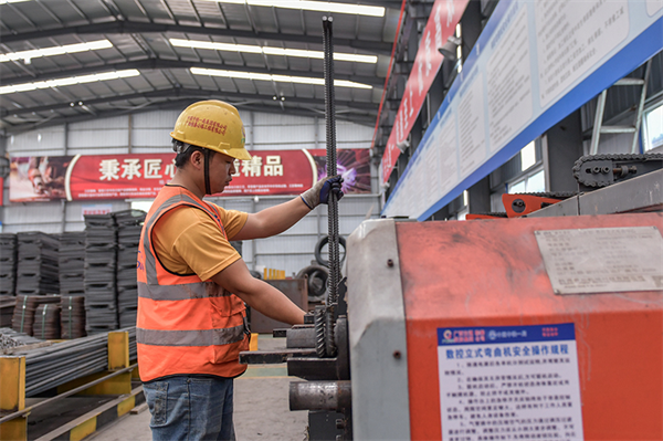 作為臨建標(biāo)準(zhǔn)化建設(shè)的重要標(biāo)志,桂鐘5、8標(biāo)段的鋼筋加工廠,廠房高度12米,作業(yè)場地平整、硬化。加工場內(nèi)醒目位置都設(shè)置工程公示牌、施工平面布置圖、安全生產(chǎn)牌、消防保衛(wèi)牌、管理人員名單及監(jiān)督電話牌、文明施工牌等明示標(biāo)志。加工廠內(nèi)按照功能設(shè)立了原材料堆放區(qū)、鋼筋下料區(qū)、加工制作區(qū)、鋼筋籠預(yù)拼接區(qū)、半成品堆放區(qū);還設(shè)置安裝了龍門數(shù)控切割機(jī)、全自動數(shù)控液壓鋼筋調(diào)直切斷機(jī)、鋼筋快速鋸床、數(shù)控鋼筋彎曲機(jī)、數(shù)控鋼筋調(diào)直機(jī)、數(shù)控鋼筋彎箍機(jī)、數(shù)字化工業(yè)焊接機(jī)器人、數(shù)控滾籠焊機(jī)、數(shù)控立式彎曲中心、全自動數(shù)控彎箍機(jī)、鋸切套絲打磨生產(chǎn)線等等機(jī)械化、數(shù)字化設(shè)備并懸掛著機(jī)械操作安全規(guī)定公示牌和設(shè)備標(biāo)示牌。這些工裝工藝標(biāo)準(zhǔn)化為項目部標(biāo)準(zhǔn)化建設(shè)賦能。