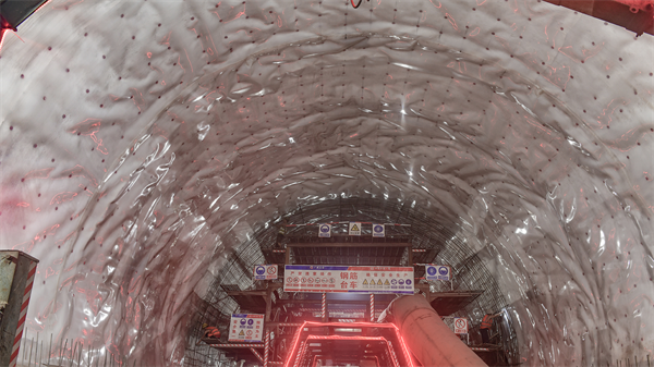 柳梧鐵路項目,配置的自行式液壓棧橋進行仰拱襯砌和仰拱填充施工,實現(xiàn)鋼筋綁扎、混凝土施工、養(yǎng)護等多工序平行作業(yè);配置的模板液壓定位系統(tǒng)和止水帶定位夾具,保證定位精度和施工效率的提高;使用防水板鋪掛臺車,實現(xiàn)4米寬幅防水板的鋪設(shè),減少防水板搭接尺寸,降低防水板損耗率和提高作業(yè)效率。對標(biāo)準(zhǔn)化施工最具實際意義的是采用的全液壓自動澆筑襯砌模板臺車,其主要由模板系統(tǒng)、門架系統(tǒng)、輔助操作系統(tǒng)、支撐系統(tǒng)、分料系統(tǒng)、平移頂升機構(gòu)、行走系統(tǒng)組成,通過增設(shè)調(diào)節(jié)塊,能適用不同加寬值斷面隧道拱墻襯砌施工;二方面,其前端創(chuàng)新地使用可調(diào)式高分子堵頭模,就具備止水帶定位和固定功能;三是平臺設(shè)計自動布料系統(tǒng),能夠?qū)崿F(xiàn)逐窗灌注;四是頂部設(shè)置徑向注漿、溢漿、排氣裝置,滿足了帶模注漿工藝;五是端頭采用軟搭接,防止頂裂上一板混凝土,為保證混凝土質(zhì)量提供了保險。