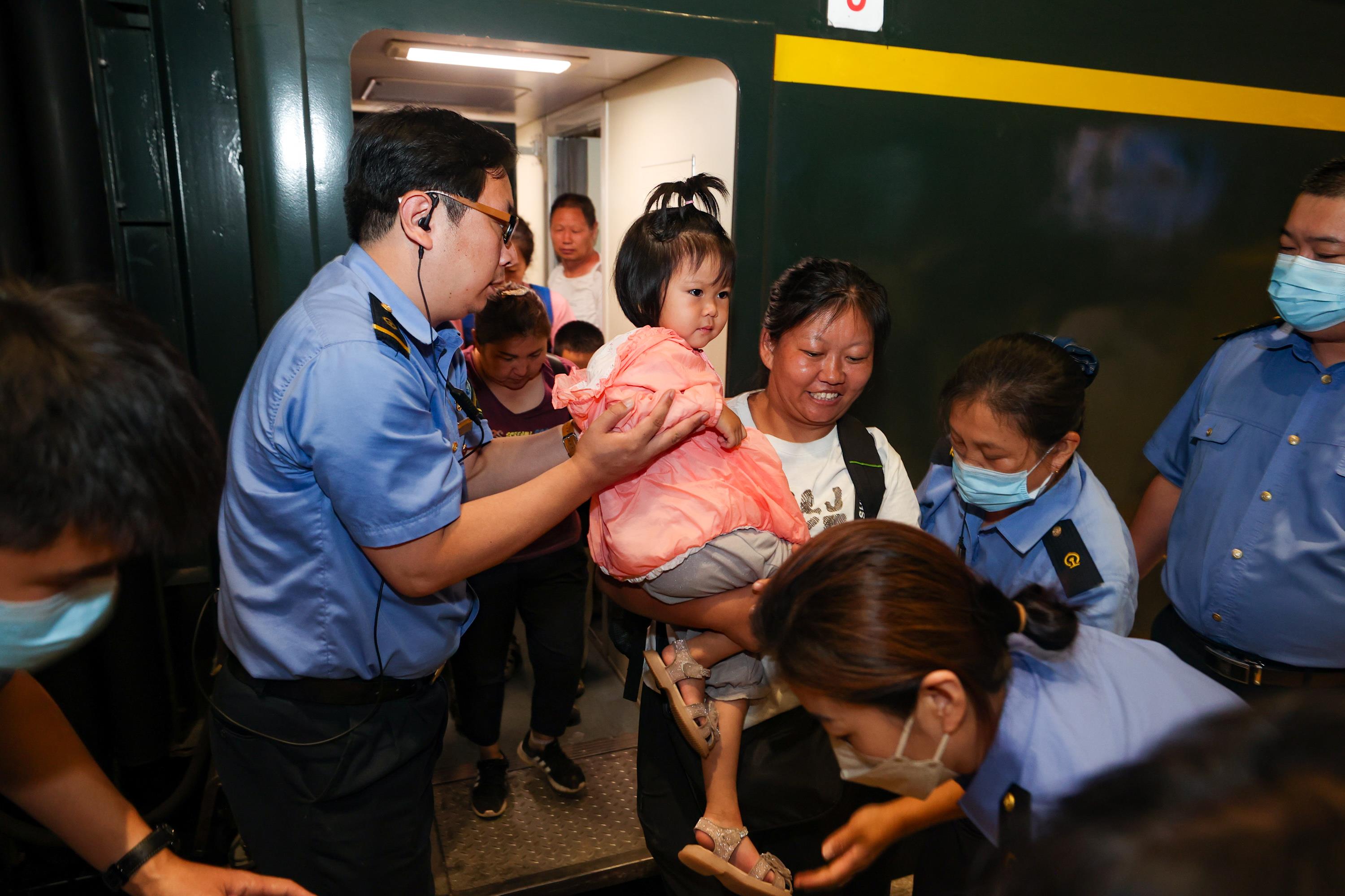 △2023年8月2日,因強(qiáng)降雨被困的K396次列車第二批近500名旅客在救援隊(duì)的一路護(hù)送下,徒步五個(gè)小時(shí)抵達(dá)妙峰山鎮(zhèn)水峪嘴村。稍作休整后,他們乘坐臨時(shí)旅客列車前往北京豐臺(tái)站。
