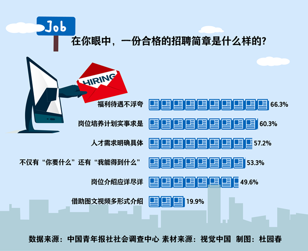 日前,中國青年報社社會調查中心聯(lián)合問卷網(wǎng)(wenjuan.com),對1334名應屆大學生進行的一項調查顯示,在他們眼中,一份合格的招聘簡章,首先是福利待遇不浮夸(66.3%),其次是崗位培養(yǎng)計劃實事求是(60.3%),再次是人才需求明確具體(57.2%)。