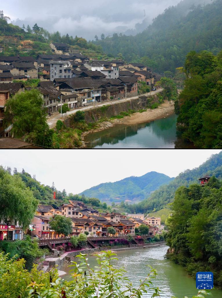 拼板照片:上圖為2014年10月22日拍攝的寧德市壽寧縣下黨鄉(xiāng)下黨村村貌(新華社記者姜克紅攝);下圖為2023年8月5日拍攝的寧德市壽寧縣下黨鄉(xiāng)下黨村新貌(新華社記者林善傳攝)。新華社發(fā)