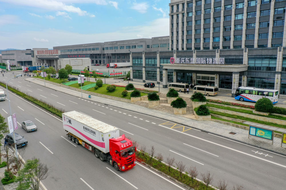 2023年10月11日,滿(mǎn)載筆記本電腦配件、發(fā)電機(jī)組件等產(chǎn)品的西部陸海新通道跨境公路班車(chē)從重慶南彭公路保稅物流中心駛出,將途經(jīng)廣西憑祥,直達(dá)越南(無(wú)人機(jī)照片)。新華社記者 黃偉 攝