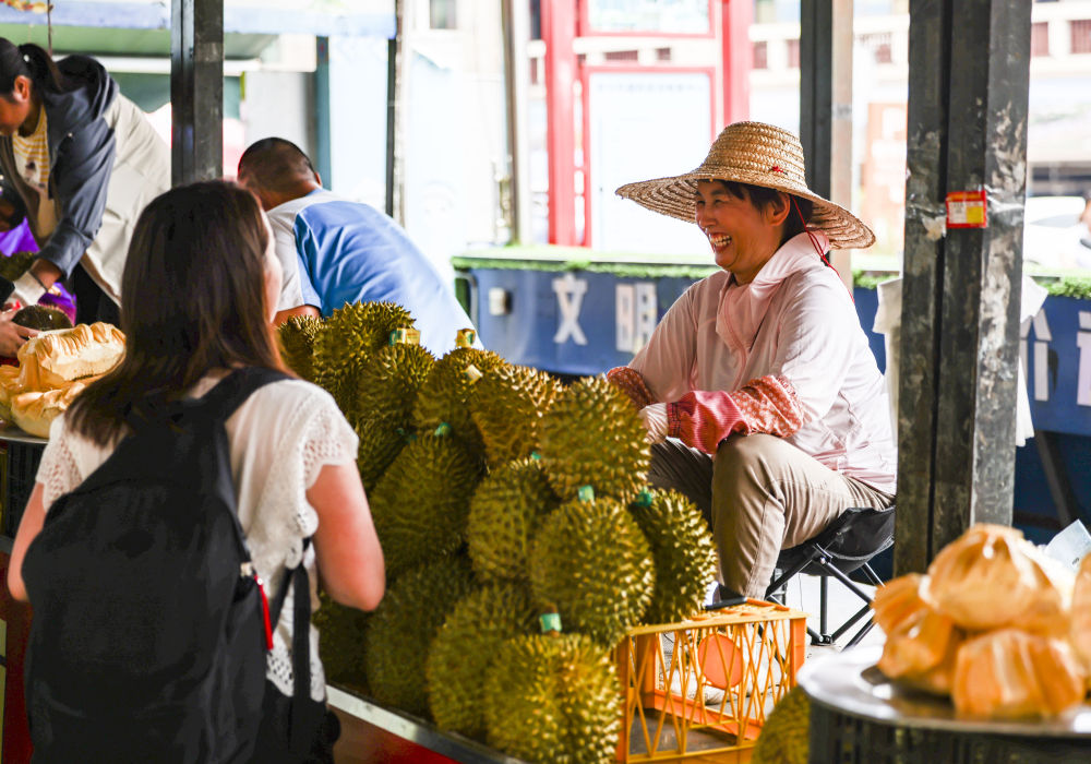 2023年5月18日,越南果商在廣西東興售賣(mài)榴蓮。新華社記者 胡星宇 攝