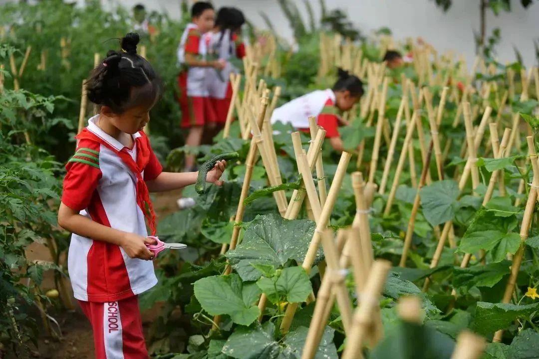 △今年6月,育英學校小農場迎來豐收,同學們在采摘蔬菜。