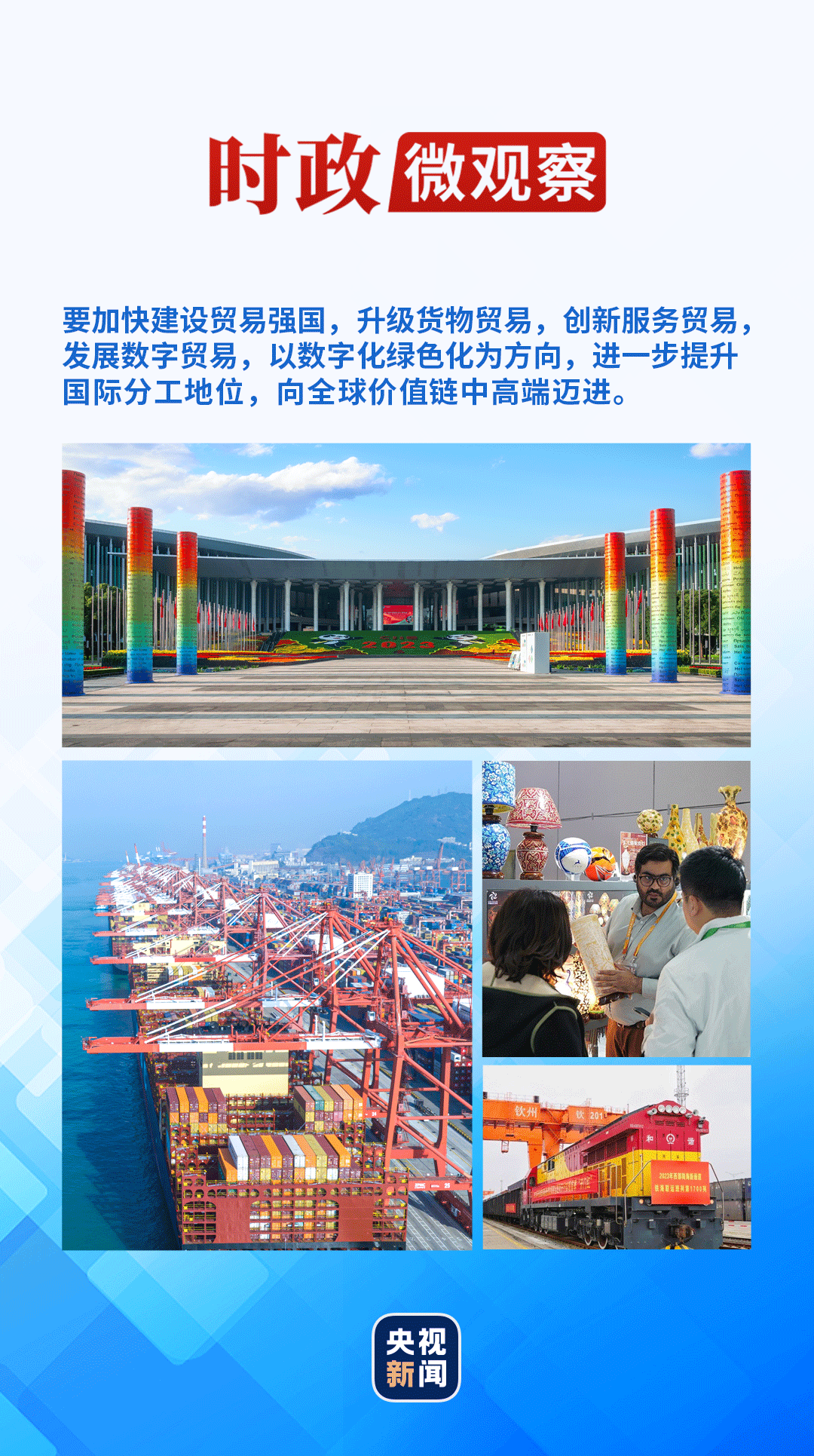習(xí)近平總書記強(qiáng)調(diào):“要加快建設(shè)貿(mào)易強(qiáng)國,升級(jí)貨物貿(mào)易,創(chuàng)新服務(wù)貿(mào)易,發(fā)展數(shù)字貿(mào)易,以數(shù)字化綠色化為方向,進(jìn)一步提升國際分工地位,向全球價(jià)值鏈中高端邁進(jìn)。”