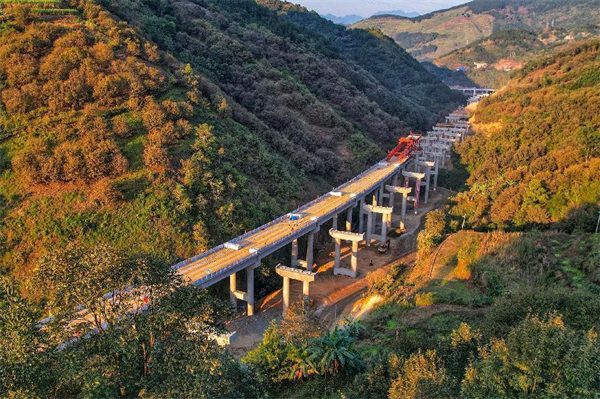 隆林樞紐立交橋,從航拍圖上看,通向四方的幾條匝道像是龍爪,主線似龍身,組成了猶如盤踞在山間的“龍”。在架設(shè)匝道T梁時(shí),按照施工組織設(shè)計(jì),T梁從D匝道推進(jìn)到上跨汕昆高速公路單獨(dú)的鋼箱梁吊架是已經(jīng)合龍的。但架梁展開時(shí)意外出現(xiàn),鋼箱梁因其他原因未能到位——似乎成了考驗(yàn)魏玉“虎”能否撼動這條“龍”的試金石。魏玉虎應(yīng)急預(yù)案祭出:運(yùn)梁車把T梁運(yùn)到鋼箱梁附近,吊車把3跨梁吊架到鄰近D匝道的A匝道上,架橋機(jī)通過過渡工程,在A匝道繼續(xù)架梁;A匝道就成為關(guān)鍵線路,項(xiàng)目部立即集中火力搶做A匝道上的橋墩,確保架梁能繞道繼續(xù)前進(jìn)。這可以說“虎”勝“龍”。