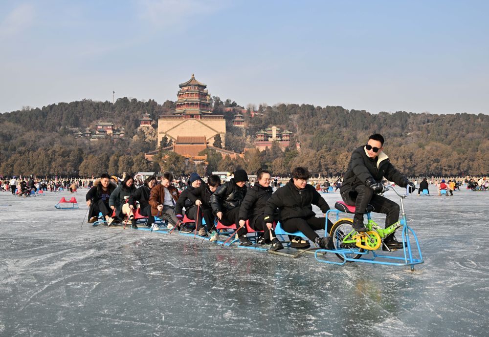 2024年1月1日,游客在北京頤和園冰場(chǎng)玩冰車(chē)和冰上自行車(chē)。新華社記者 陳曄華 攝