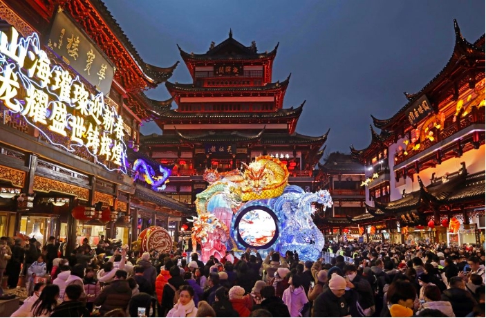 2024年1月21日,游客在豫園商城中心廣場賞燈拍照。當日,2024上海豫園民俗藝術燈會正式亮燈。今年豫園燈會續(xù)寫“山海奇豫記”,以“海經(jīng)篇”為主題,生肖龍燈、海底世界、魚群起舞、奇幻仙境等場景讓游客在燈火絢爛的國風幻境中喜迎龍年新春。新華社記者 劉穎 攝