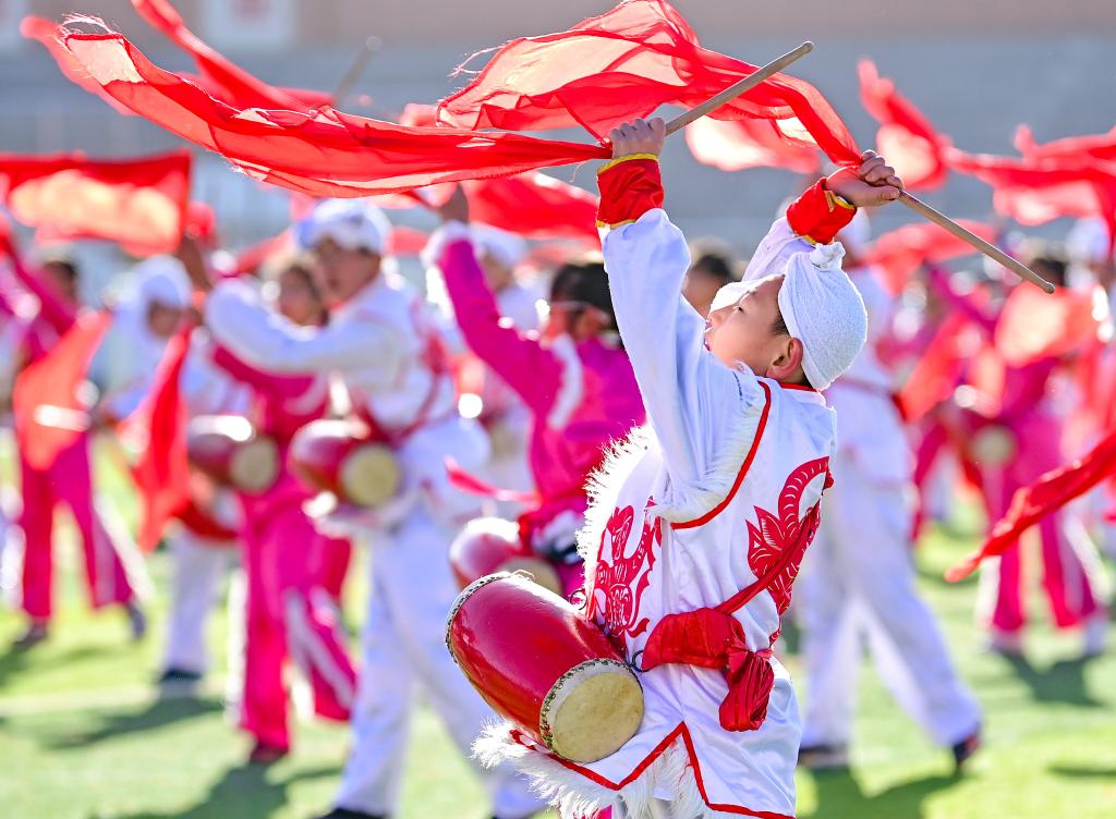2023年11月16日,內(nèi)蒙古鄂爾多斯市鄂托克前旗第二小學(xué)的學(xué)生在大課間表演安塞腰鼓。該校將安塞腰鼓列入學(xué)校的校本課程和大課間活動(dòng),聘請(qǐng)民間藝人傳授技藝,讓非遺文化在校園中傳承。新華社發(fā)(王正攝)