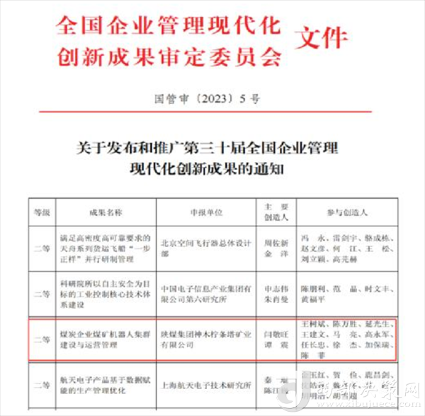 西部決策網(wǎng)訊 近期,全國企業(yè)管理現(xiàn)代化創(chuàng)新成果審定委員會(huì)印發(fā)《關(guān)于發(fā)布和推廣第三十屆全國企業(yè)管理現(xiàn)代化創(chuàng)新成果的通知》。檸條塔礦業(yè)公司管理創(chuàng)新成果《煤炭企業(yè)煤礦機(jī)器人集群建設(shè)與運(yùn)營(yíng)管理》獲二等獎(jiǎng),是陜煤集團(tuán)所屬煤炭生產(chǎn)企業(yè)唯一一家獲獎(jiǎng)單位。