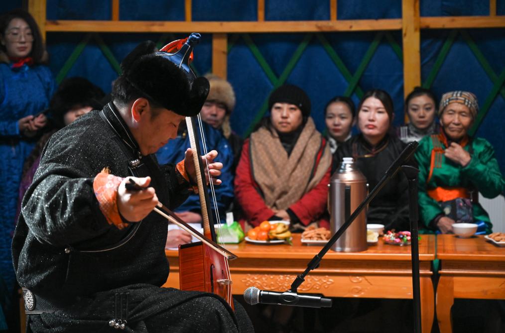 2023年12月21日,烏蘭牧騎隊員在阿其圖烏拉蘇木進(jìn)行馬頭琴演奏表演。新華社記者 王楷焱 攝