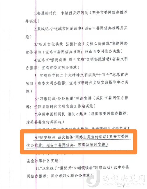活動經(jīng)過推選、初審、復審等環(huán)節(jié),評出2023年陜西好網(wǎng)民30名、陜西好網(wǎng)民工程品牌40個、優(yōu)秀組織單位10家。由延安市委網(wǎng)信辦薦送,延安市委網(wǎng)信辦、西部決策網(wǎng)實施的“延安精神 薪火相傳”網(wǎng)絡(luò)主題宣傳活動被評為2023年陜西好網(wǎng)民工程品牌項目。