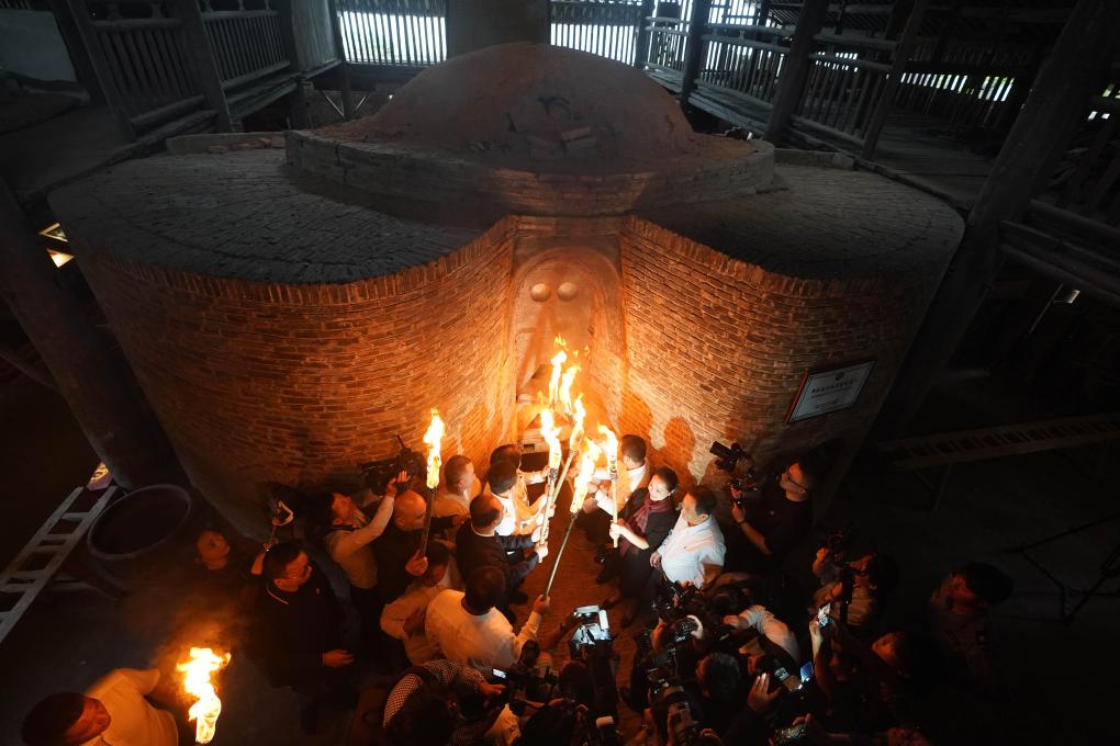 2023年10月19日,嘉賓與把樁師傅一起對葫蘆窯進行復(fù)燒點火。當(dāng)日,作為2023中國景德鎮(zhèn)國際陶瓷博覽會的活動之一,景德鎮(zhèn)古窯民俗博覽區(qū)對重建的明代葫蘆窯進行點火復(fù)燒。同時,景德鎮(zhèn)歷代瓷窯活態(tài)傳承紀實館開館。新華社記者 周密 攝