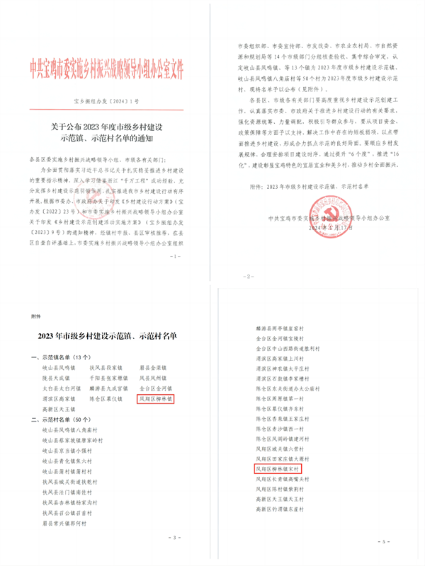 西部決策網(wǎng)訊(記者劉玉 韓宗憲 通訊員 高莉娟)近日,寶雞市委辦、市政府辦關(guān)于印發(fā)《鄉(xiāng)村建設(shè)行動(dòng)方案》(寶辦發(fā)〔2022〕23號(hào))和市委實(shí)施鄉(xiāng)村振興戰(zhàn)略領(lǐng)導(dǎo)小組辦公室關(guān)于印發(fā)《鄉(xiāng)村建設(shè)示范創(chuàng)建活動(dòng)實(shí)施方案》(寶鄉(xiāng)振組辦發(fā)〔2023〕9號(hào))的通知精神,經(jīng)鎮(zhèn)村申報(bào)、縣區(qū)審核推薦,在縣區(qū)自查自評(píng)基礎(chǔ)上,寶雞市委實(shí)施鄉(xiāng)村振興戰(zhàn)略領(lǐng)導(dǎo)小組辦公室組織市委組織部等 14 個(gè)市級(jí)部門分組核查驗(yàn)收、集中綜合審定,鳳翔區(qū)柳林鎮(zhèn)和柳林鎮(zhèn)宋村被確定為2023年度市級(jí)鄉(xiāng)村建設(shè)示范鎮(zhèn)(村)。