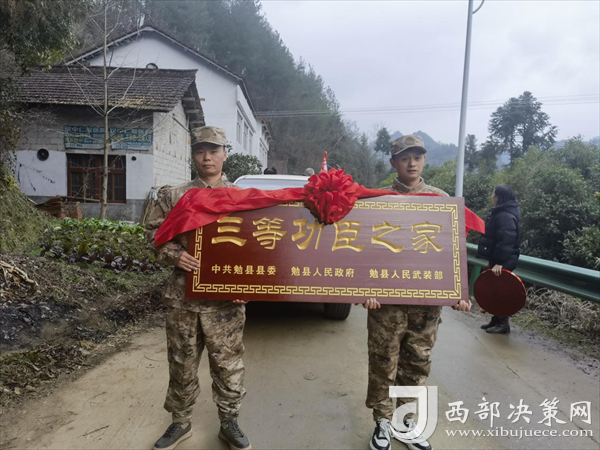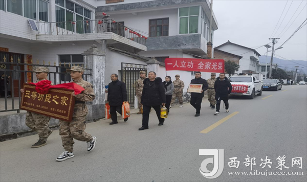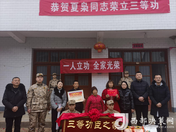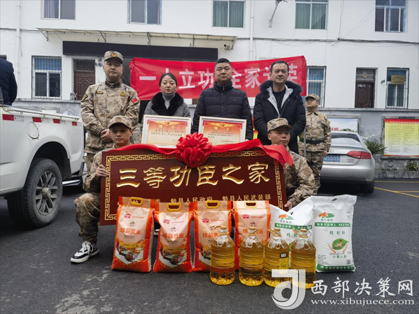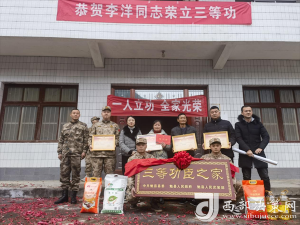 西部決策網(wǎng)訊 喜報送到家,榮譽獻功臣。春節(jié)前夕,現(xiàn)役軍人李洋、夏梟和他的家人收到了一份特殊的“禮物”。勉縣退役軍人事務局、阜川鎮(zhèn)主要領(lǐng)導、鎮(zhèn)人武部和鎮(zhèn)退役軍人服務站及村“兩委”有關(guān)負責人,專程將立功喜報、三等功臣之家牌匾送到李洋、夏梟的家中,為他送上榮譽和祝福。