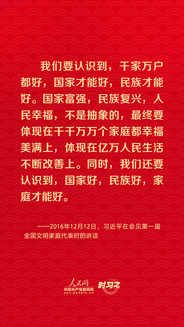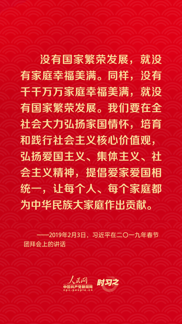 團(tuán)圓是春節(jié)永恒的主題。“沒(méi)有國(guó)家繁榮發(fā)展,就沒(méi)有家庭幸福美滿。同樣,沒(méi)有千千萬(wàn)萬(wàn)家庭幸福美滿,就沒(méi)有國(guó)家繁榮發(fā)展。”習(xí)近平總書記曾在多個(gè)場(chǎng)合深刻闡述家庭與國(guó)家之間的關(guān)系,從他的話語(yǔ)里一起感悟深厚的家國(guó)情懷。