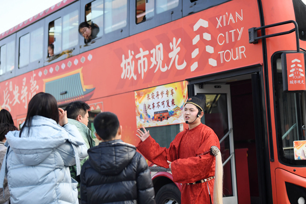 坐在由雙層公交車改裝而來的西安城市觀光車上,人們居高臨下地觀賞大明宮國家遺址公園、書院門、鐘鼓樓等西安名勝。隨車的“楊貴妃”“李白”“上官婉兒”等演員會(huì)根據(jù)所到之處展開講解,“一言不合”就同乘客對(duì)起詩、唱起曲來。