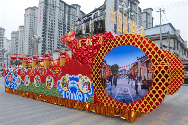 “中國泥塑第一村”彩車:寓意“龍騰四海,福耀城關(guān)”,展現(xiàn)城關(guān)鎮(zhèn)敢為人先、拼搏奮進的精氣神。