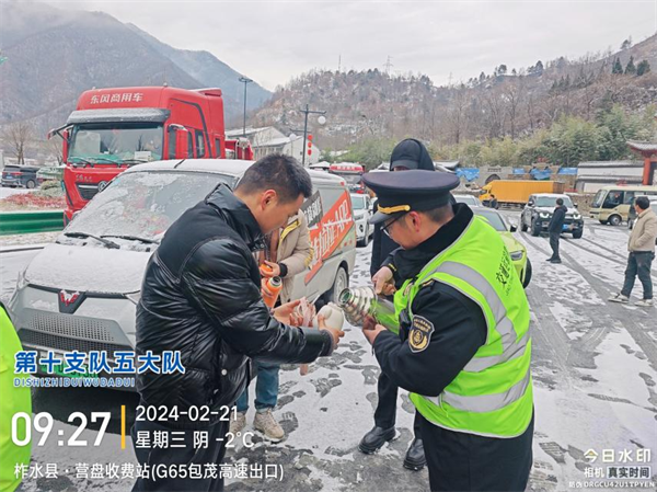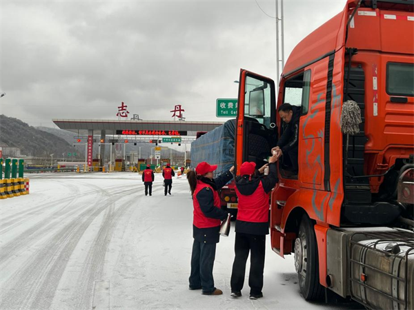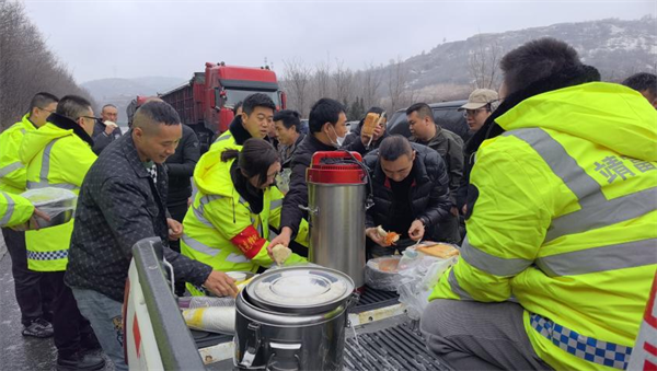 西略分公司所轄各站組織人員為司乘提供饅頭、雞蛋、豆奶、方便面、熱水等簡餐,并對滯留車輛做好解釋工作,安撫司乘焦躁情緒,讓司乘在寒潮天氣里感受到陜西交控人的溫暖與關心。(西略分公司)