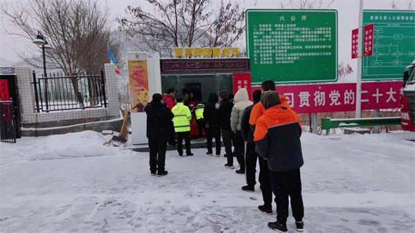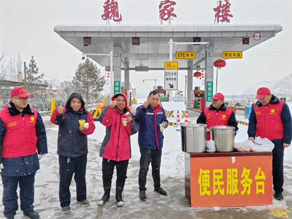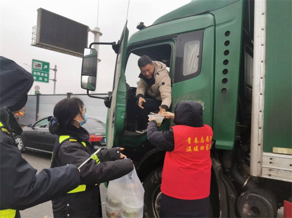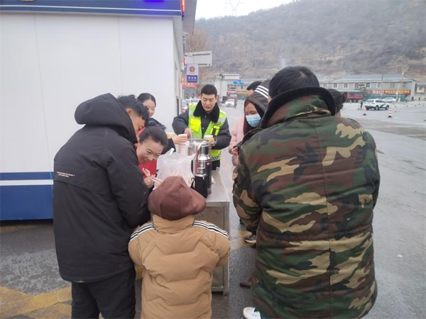 西富分公司轄區(qū)各收費站志愿服務小分隊為滯留司乘提供熱水、飯菜等,并與司乘親切交談,耐心解答道路實時情況。(朱顏)